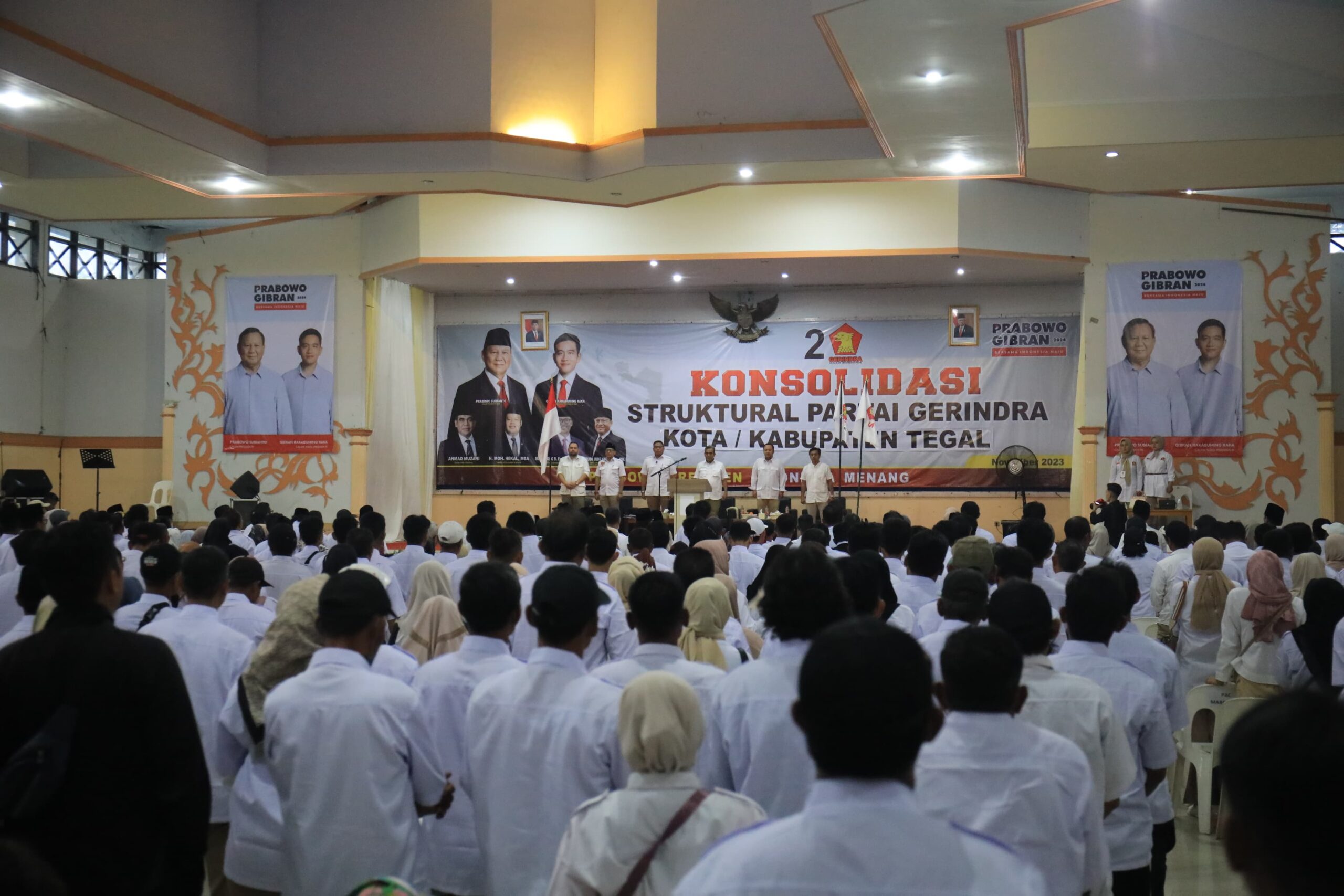 Sekjen Partai Gerindra Ahmad Muzani menghadiri konsolidasi bersama ribuan kader di Kabupaten Tegal dan Kota Tegal, Kamis (9/11). Dalam sambutannya Muzani menyinggung adanya ketidaksukaan terhadap pasangan capres cawapres Prabowo Subianto-Gibran Rakabuming Raka yang akan berkontestasi pada Pilpres 2024.